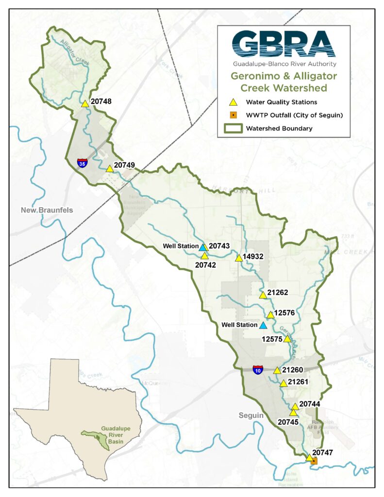 The map below shows locations of the water quality monitoring sites within the Geronimo and Alligator Creeks watershed, as well as the wastewater treatment outfall location in Seguin.